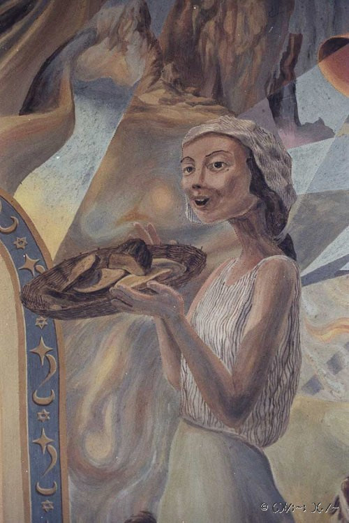 Kobieta niosąca chleb, malowidło gliną na scianie, detal, parafia Alberndorf 1991 r.